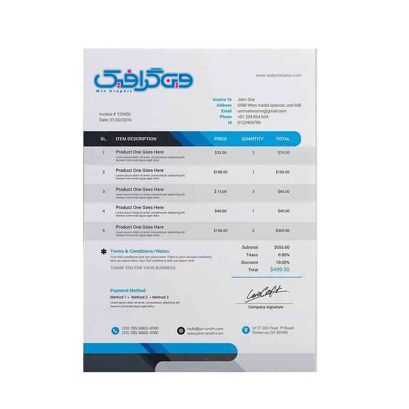 تیم وین گرافیک می‌تواند شما را در چاپ این فاکتور مهم همراهی کند تا دغدغه‌ای از بابت معتبر بودن طراحی فاکتور نداشته باشید. برای اطلاعات بیشتر با شماره 09154515226 تماس بگیرید.